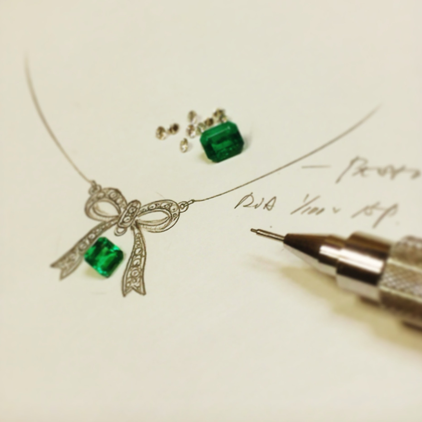 お相手の誕生石、エメラルドを使ったリボンペンダントをご依頼いただきました。デザイン的にベストな四角い石を選択。ダイヤもVSメレーで特級品をご用意いたしました。